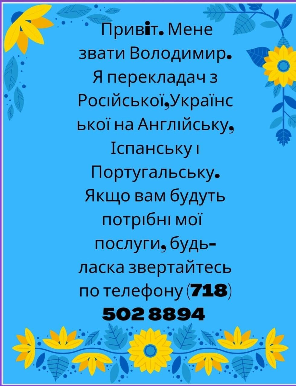 Добрий день. Я усний і письмовий перекладач з російської та української на англійську, іспанську та португальску мову.+1 (718) 502-8894