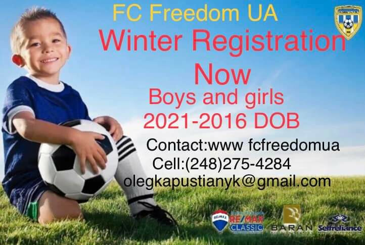 FC Freedom UA відкриває реєстрацію на зимовий період та для майбутніх сезонів дітей 2021-2016 р/н. Цікаві тренування з професійними дитячими тренерами забезпечить швидкий прогрес ваших дітей. Зв’яжіться з нами за контактами які вказані на оголошенні(питати Олега). Клуб відкриває реєстрацію для Перших Українських команд дівчат(2019-2015 р/н). Кого цікавить-телефонуйте (248)275-4284 Олег