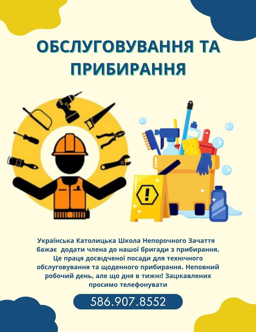 Українська Католицька Школа Непорочного Зачаття бажає додати члена до нашої бригади з прибирання.