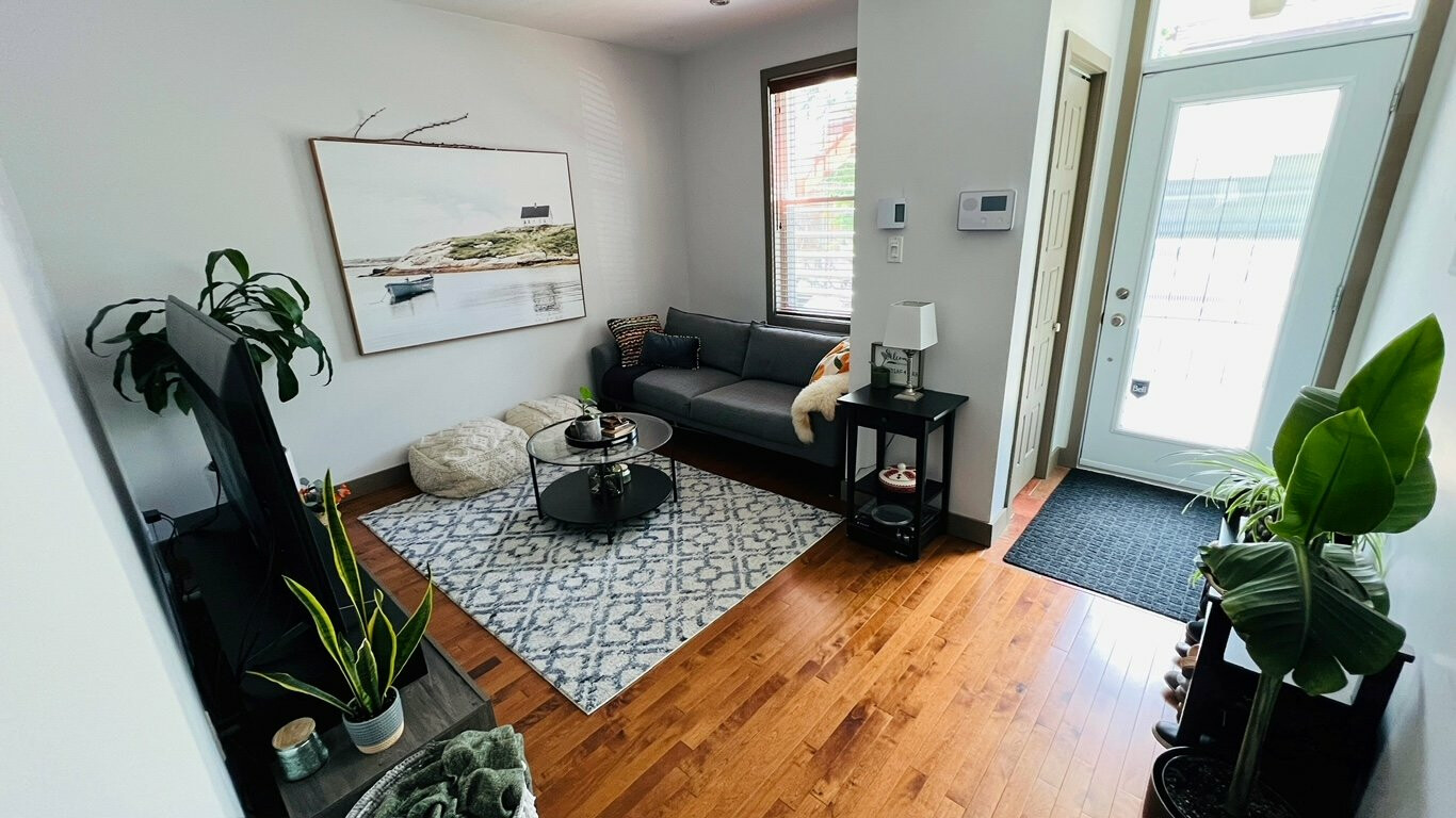 Beautiful, modern and fully renovated two-storey main floor unit of a duplex, with appliances, air conditioning and central vacuum included, on a quiet street in Rosemont Petite-Patrie, featuring two closed bedrooms, large kitchen, two living rooms, laundry room, work area, storage room (for bikes, sports equipment, food, etc.), large private terrace, as well as two private parking spaces