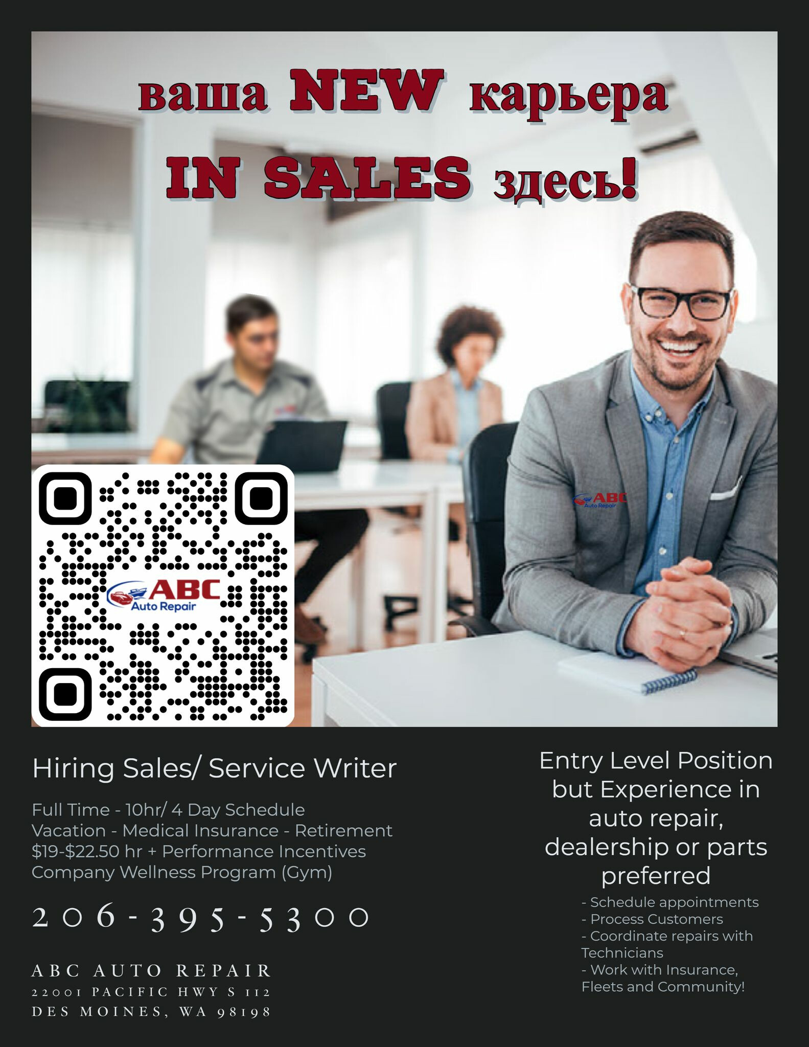 Шукаємо фахівця з сервісу/ офісного помічника/ продавця в нашу команду продажів. Ми служимо великій російсько-українськомовній спільноті. Треба вміти читати та говорити англійською хоча б до середнього рівня. Будь ласка, напишіть мені, якщо у вас є питання або хочете дізнатися, чи пройде ваша англійська - телефонуйте 206-395-5300 - понеділок-неділя 7:00-6 вечора.