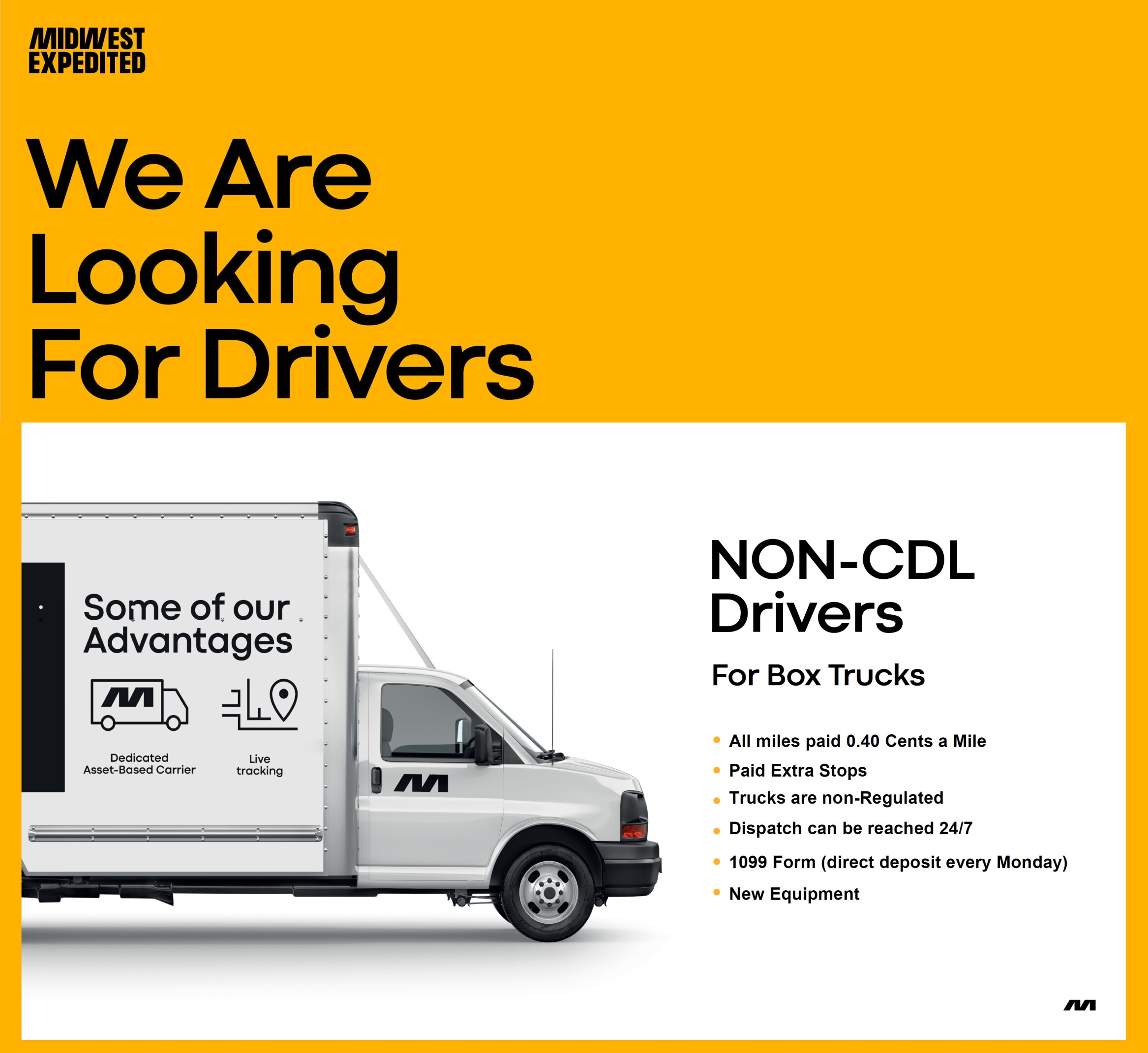 Транспортна компанія Midwest Expedited набирає водіїв водії класу С (26ft box trucks) а також водіїв зі звичними водійськими правами (16ft box trucks). Робота по всіх штатах і Канаді.