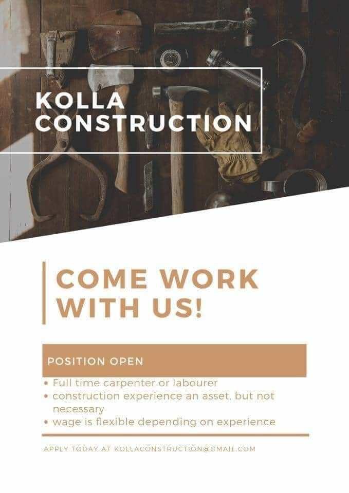 Kolla Construction шукає найняти тесляра або будівельника на повний день.