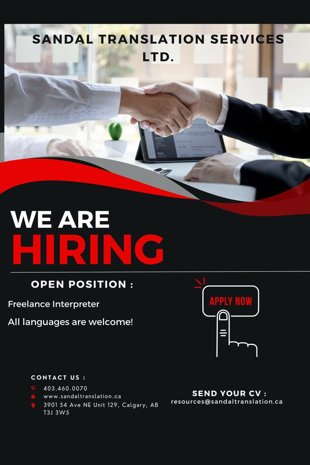 Sandal Translation Services прагне надавати якісні послуги перекладу по всій Канаді з головним офісом в Наразі Sandal Translation Services LTD. шукає перекладачів для очного перекладу на місці в юридичних, медичних та громадських умовах. Види вакансій: повсякденний, вільний.