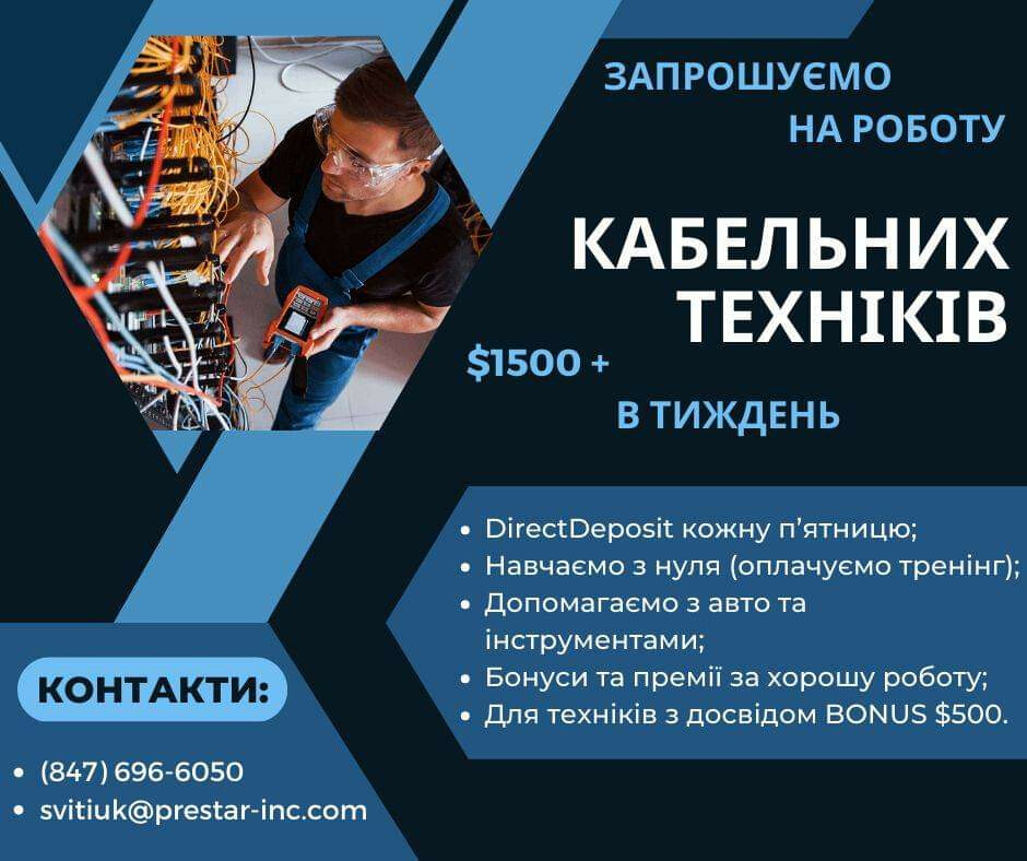 Запрошуємо на роботу кабельних техніків (можна БЕЗ досвіду роботи)