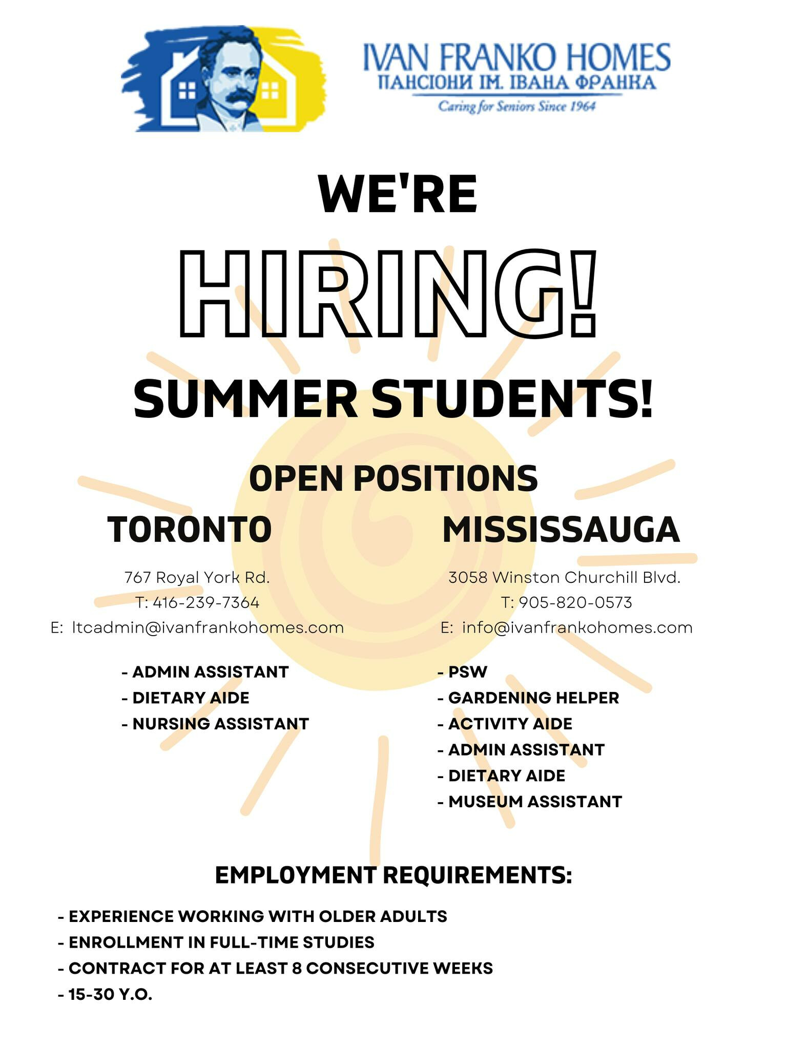 Ми НАЙМАЄМО! Будинки Івана Франка в Торонто і Міссіссага потребують студентів на літо: помічник адміністратора, помічник з харчування, помічник медсестри, PSW, помічник із садівництва, помічник з діяльності, помічник музею.