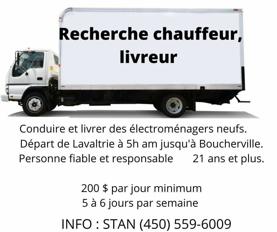 Привозити та доставляти нову техніку. Відправлення з Лавальтрі о 5 ранку до Бушервіля. Надійна та відповідальна людина від 21 року.