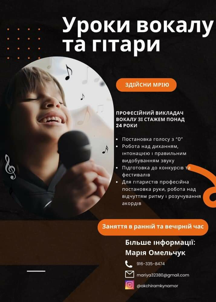 Постановка голосу з "0". Робота над диханням, інтонацією і правильним видобуванням звуку. Підготовка до конкурсів та фестивалів. Для гітаристів професійна постановка руки, робота над відчуттям ритму і розучування акордів.