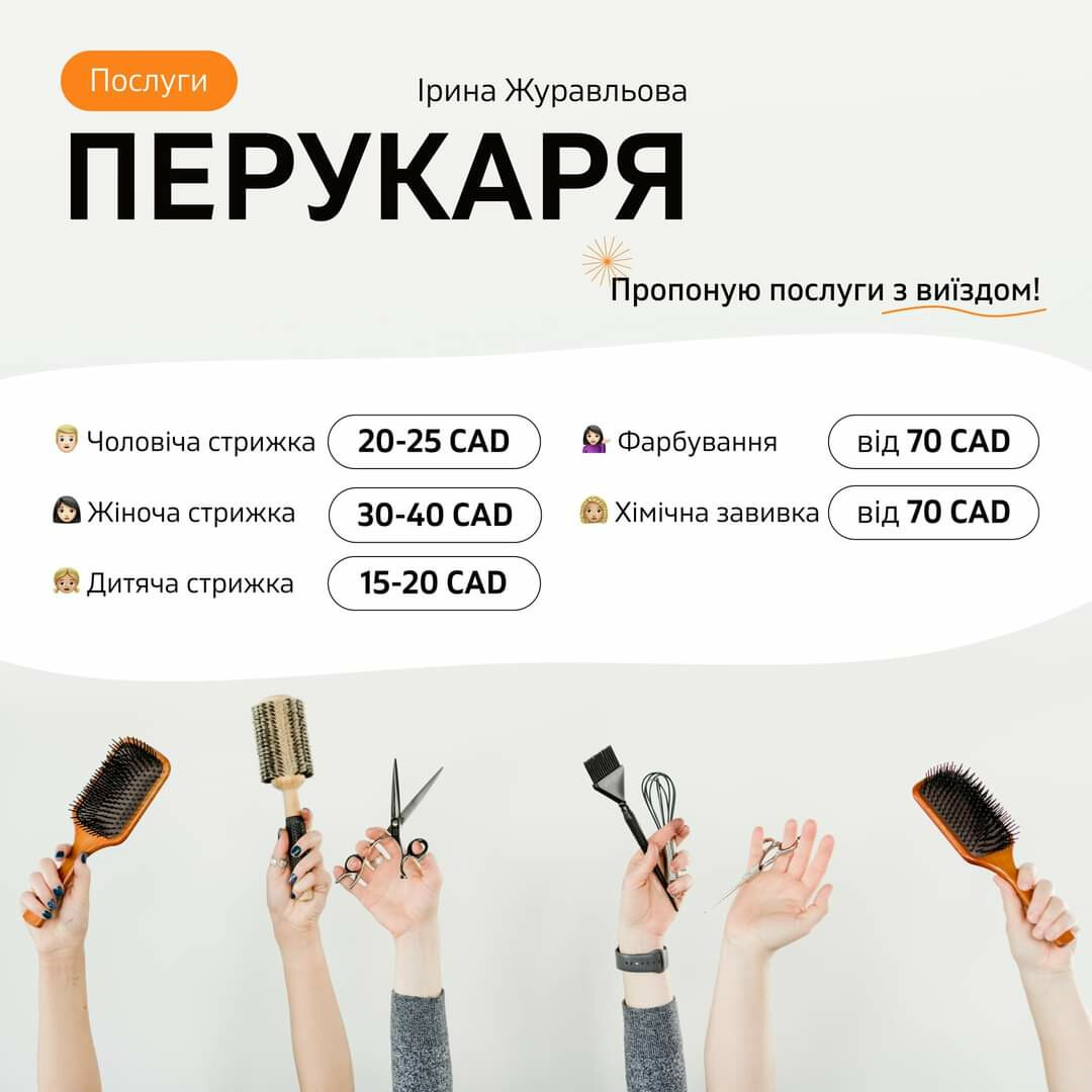 - Жіноча стрижка 30-40 CAD;