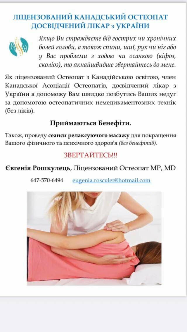 Як ліцензований Остеопат з Канадійською освітою, член Канадської Асоціації Остеопатів, досвідчений лікар з України я допоможу Вам швидко позбутись Ваших недуг за допомогою остеопатичних немедикаментозних технік (без ліків).