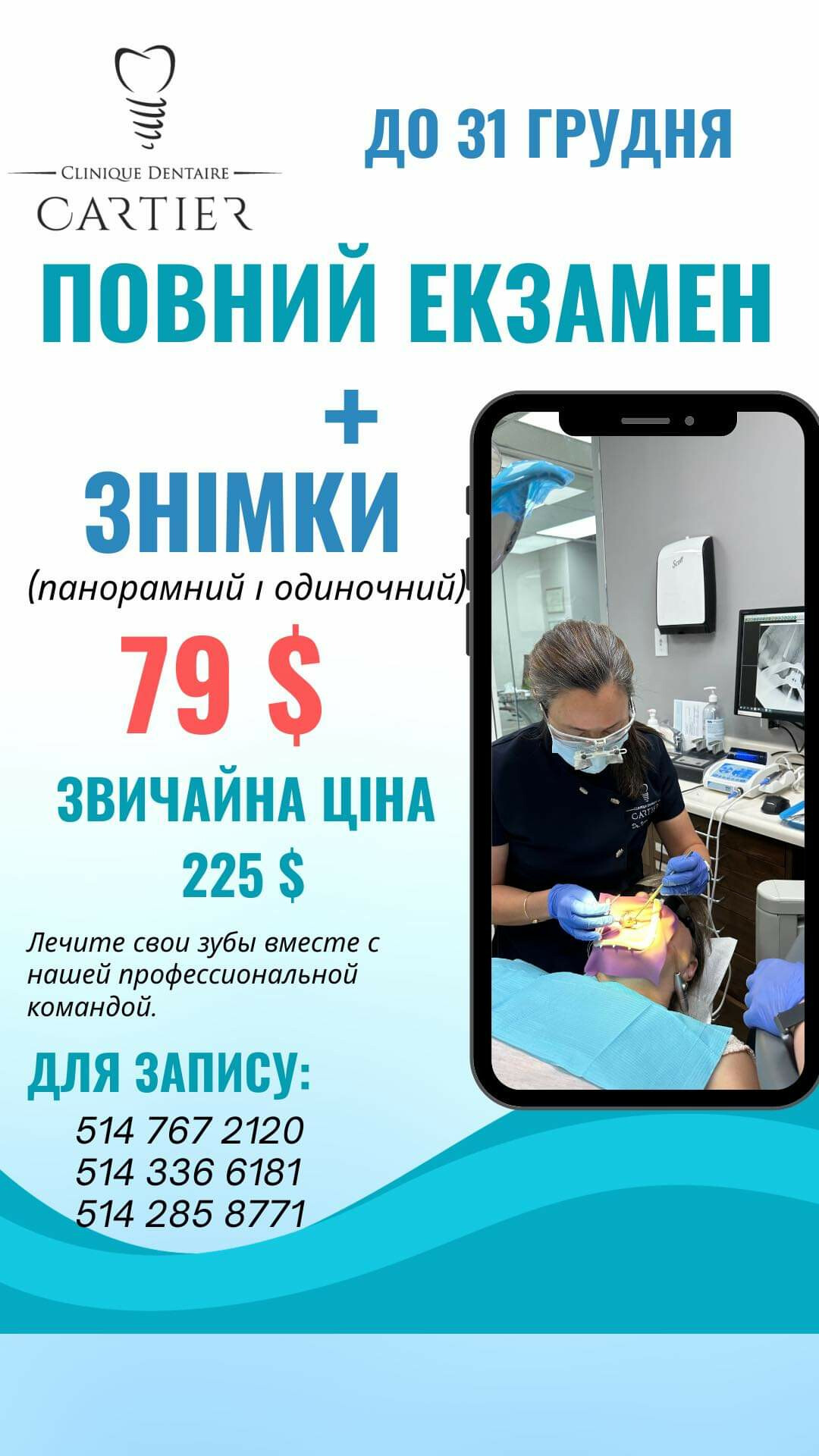 Запрошуємо в стоматологічну клініку Cartier в Монреалі і даруємо знижку -20% на будь-яке лікування всім українцям, які прибули в Монреаль вже після повномасштабного вторгнення в Україну.