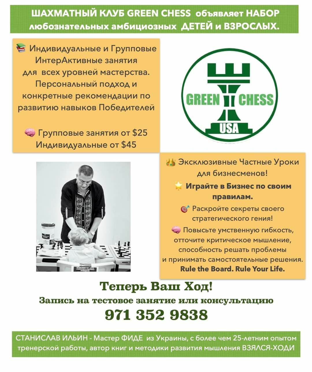 Шахматний клуб GREEN CHESS оголошує набір допитливих амбітних дітей та дорослих.