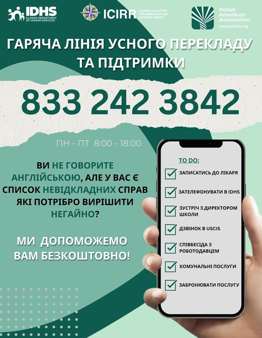 Гаряча лінія усного перекладу та підтримки допоможе вам подолати мовний бар'єр в отриманні послуг чи консультацій.