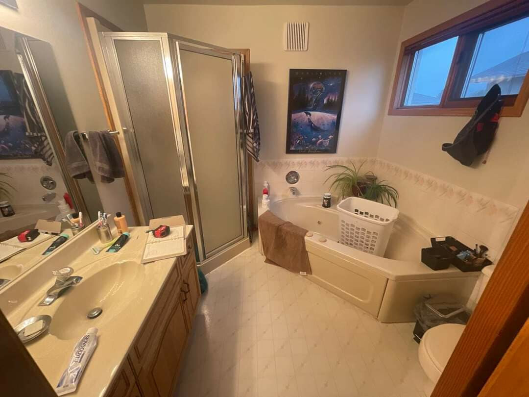 Завдання полягає в тому, щоб створити простору ванну кімнату, з великим душем, подвійним умивальником та великим місцем для зберігання речей.