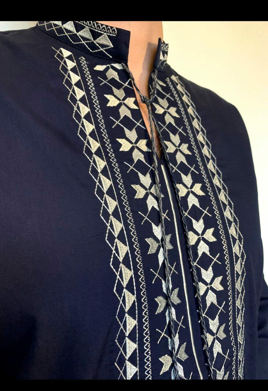 The photo shows a navy long-sleeved men's shirt with silver embroidery.