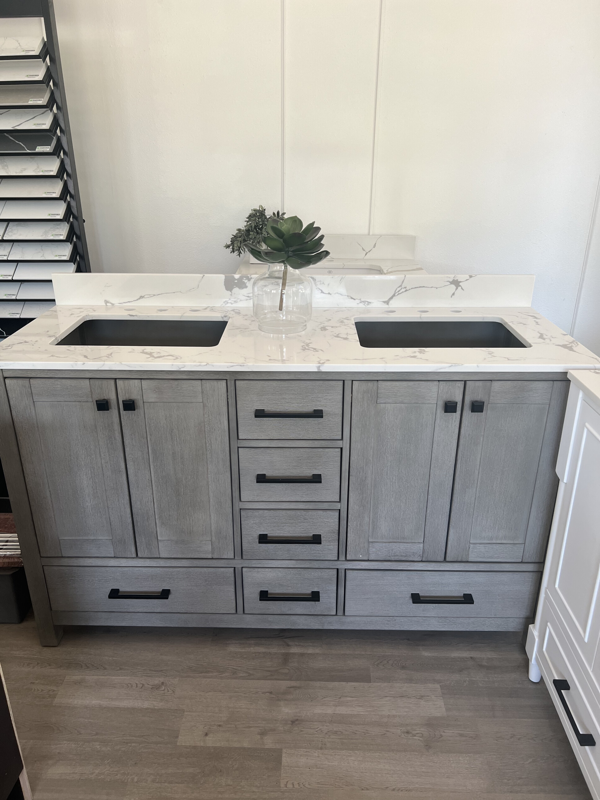 This vanity made with birch wood, plywood boxes and soft close. The price includes the countertop and sink