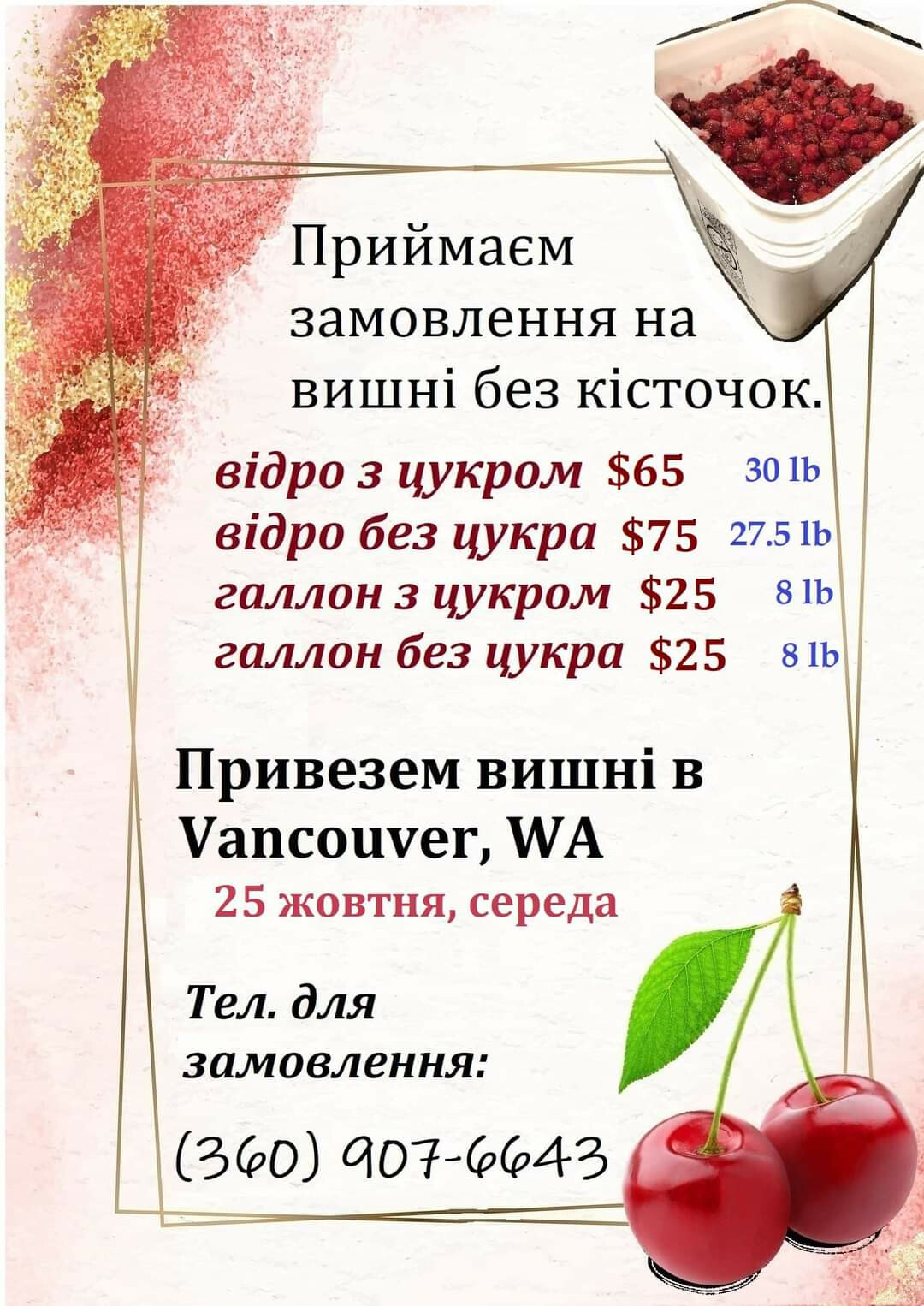 Для замовлення вишні надішліть мені повідомлення або зателефонуйте (360)907-6643.