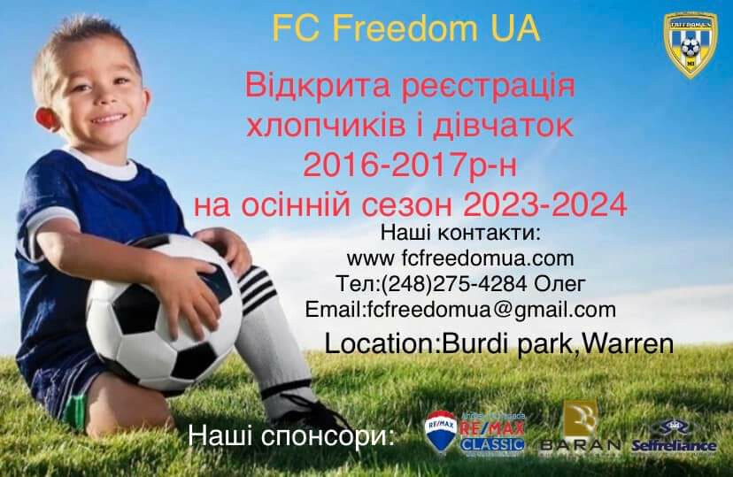 Український футбольний клуб FC Freedom UA запрошує хлопчиків і дівчаток 2016-2017 р-н приєднатися до нас для участі в осінньому сезоні 2023/2024. Спеціальна передакадемічна програма. Ліцензовані тренера (Національноі та Регіональної категорії) забезпечують швидкий прогрес дітей. Не зволікайте-кількість вільних місць обмежена. Більше інформації на нашому веб-сайті: www.fcfreedomua.com або за телефоном: (248) 275-4284 Олег.