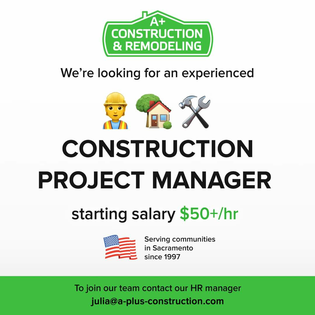 Резюме та всі питання надсилати на пошту julia@a-plus-construction.com або за номером (916) 970-0047.