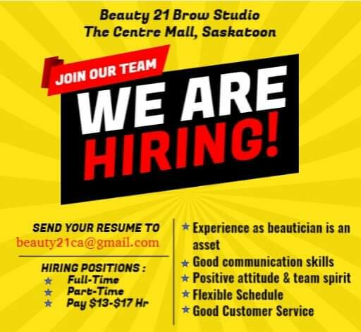 Beauty 21 Brow Studio шукає естетиків для брів/обличчя та депіляції тіла для нашого розташування в ТРЦ Центр, Саскатун Ѕк