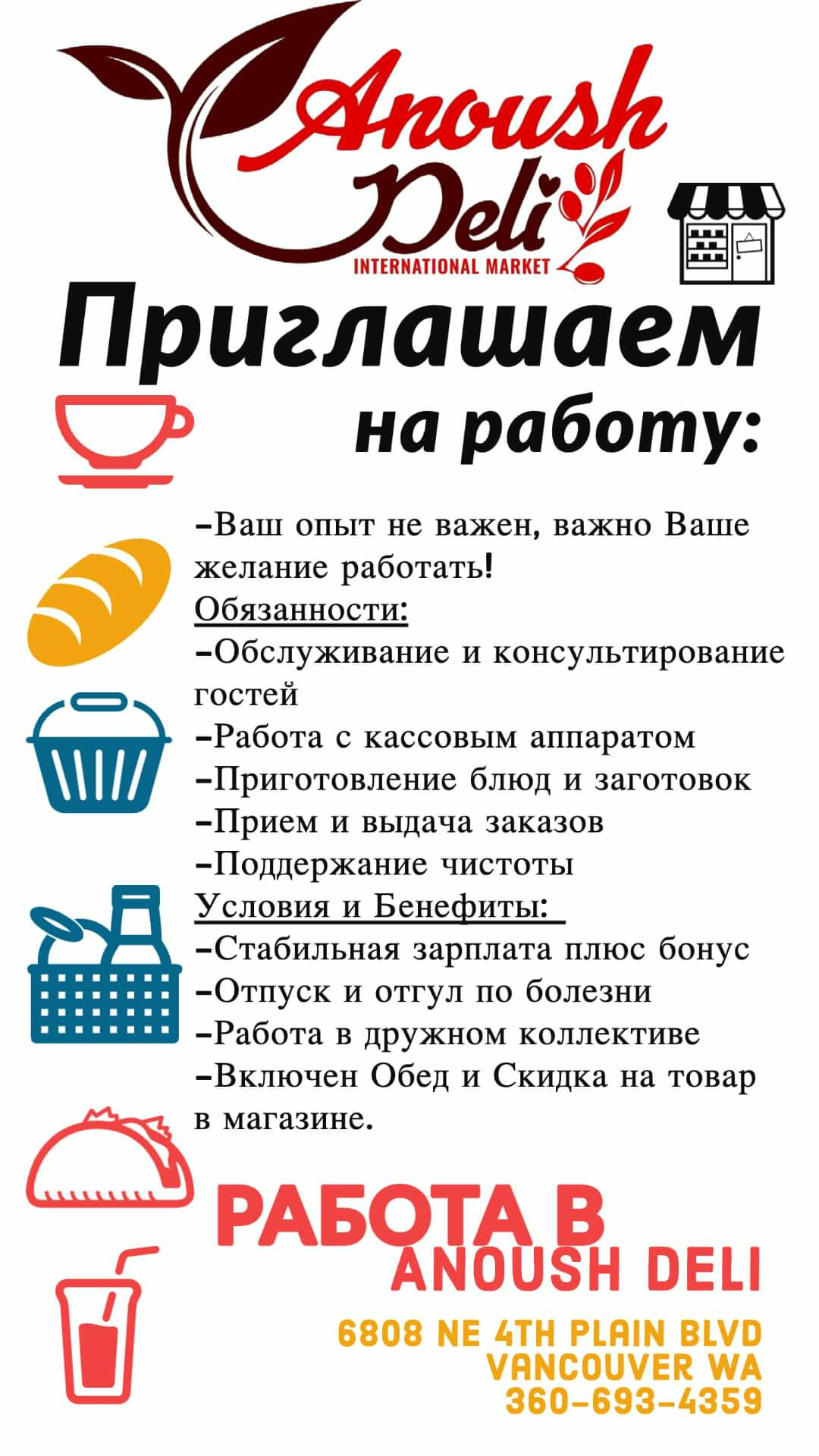 Відкрито вакансію кассир/кухар в магазині Ануш Дели. Робота на 20-30 годин на тиждень від 3 до 5-ти робочих днів, включаючи суботу та неділю. Початкова ставка $16 на годину плюс щомісячні бонуси до зарплати.