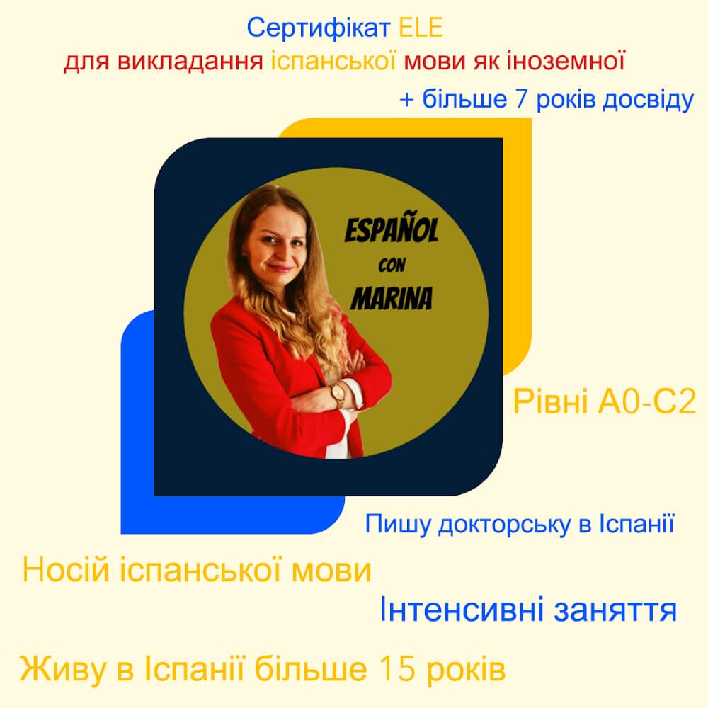 Якщо ви зацікавлені, будь ласка, напишіть мені в Telegram: mk_ma або в приватні повідомлення. Ви також можете безкоштовно приєднатися до мого Instagram (marina_tu_profe) де я завантажую лексику, ідіоми, граматику та культуру Іспанії. Дякую