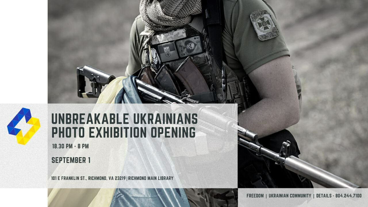 Всім добрий день! Запрошуємо на відкриття фото виставки Unbreakable Ukrainians, яке пройде 1 вересня з 18.30 до 20.00 в Richmond Public Library. На заході будуть представлені фотографії відомих фотографів, що висвітлюють події в Україні. На відкритті виставки буде проходити тихий аукціон. Зможете придбати цікаві артефакти.