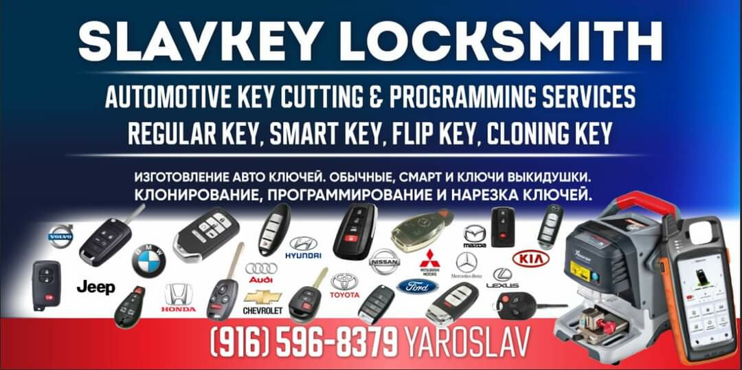 Ласкаво просимо у світ автомобільних ключів з Slavkey Locksmith. Пропоную виготовлення автомобільних ключів, смарт-ключі, ключі викидушки. При повній втраті або дублікати, програмування та нарізка ключів. Ціни різні. Залежить від машини, ключа, відстані куди їхати, при повній втраті або дублікати та роботи. Якщо заготівля ключа клієнта ціна за програмування та нарізку ключа from $100 аnd up. Інші роботи розглядаються індивідуально. Відкриття дверей автомобіля з ключами або без усередині автомобіля також ціна залежить від відстані шляху від $100 and up. Пишіть повідомлення за телефоном або дзвоніть (916) 596-8379