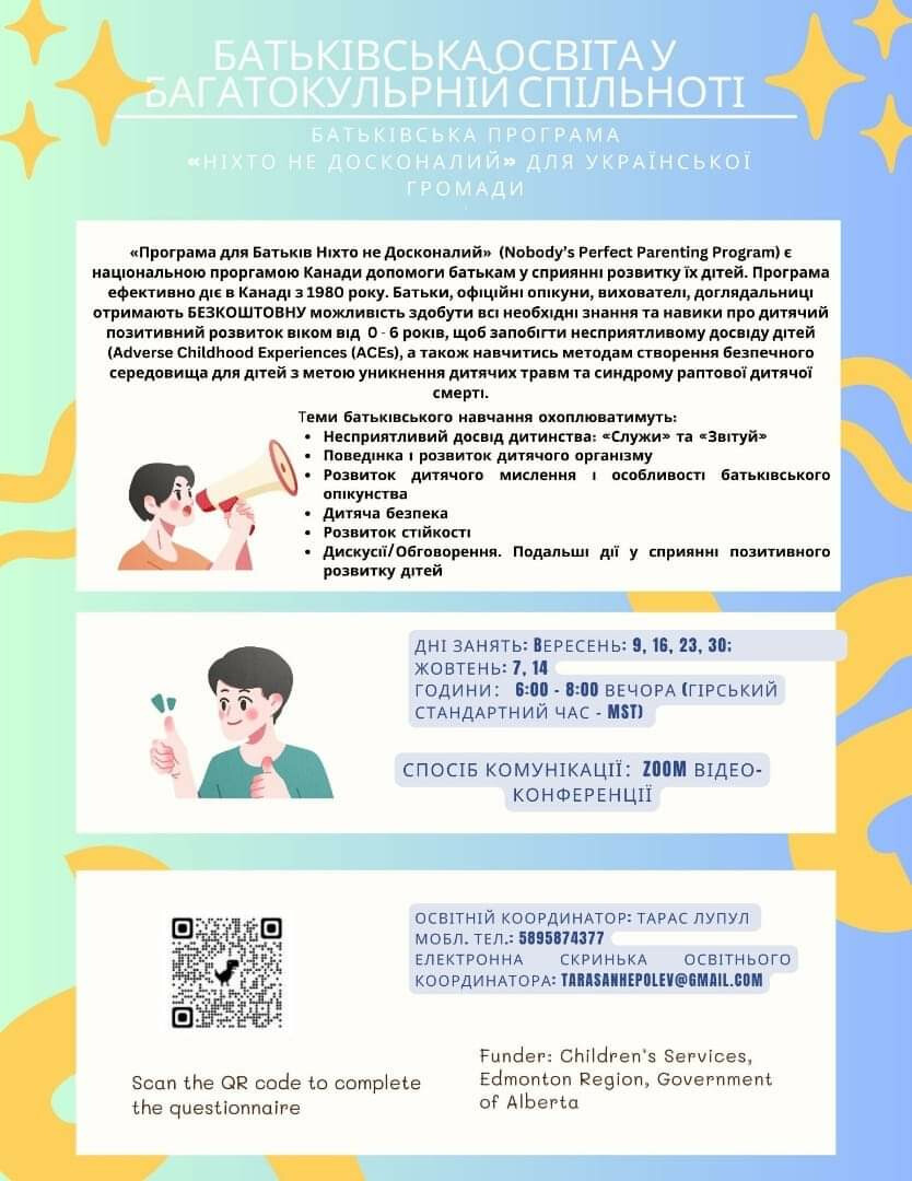 Програма для Батьків "Ніхто не Досконалий" (Nobody's Perfect Parenting Program) є національною проргамою Канади допомоги батькам у сприянні розвитку їх дітей. Програма ефективно діє в Канаді з 1980 року. Батьки, офіційні опікуни, вихователі, доглядальниці отримають БЕЗКОШТОВНУ можливість здобути всі необхідні знання та навики про дитячий позитивний розвиток віком від 06 років, щоб запобігти несприятливому досвіду дітей (Adverse Childhood Experiences (ACEs), а також навчитись методам створення безпечного середовища для дітей з метою уникнення дитячих травм та синдрому раптової дитячої смерті.