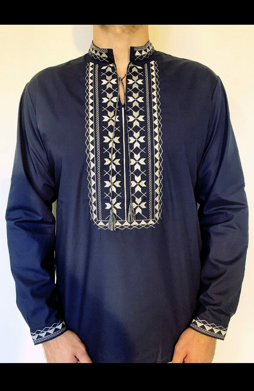 На фото чоловіча сорочка з довгим рукавом темно-морська зі срібною вишивкою.