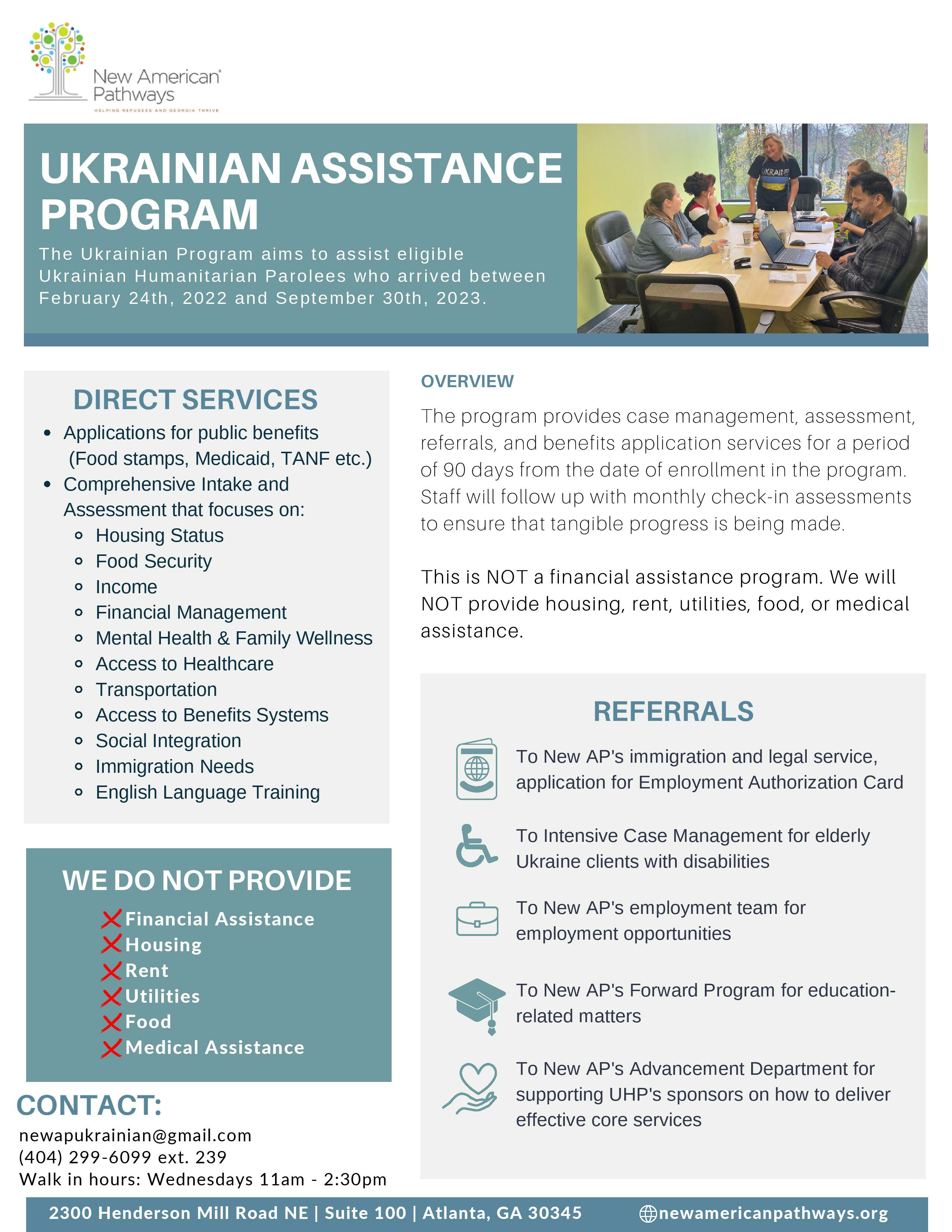 Запрошую вас звертатися до співпраці із програмою для допомоги українцям в штаті Джорджія. Всі, хто одержав гуманітарний пароль (U4U/UHP, TPS/DT) можуть звернутися до організації New American Pathways (https://www.newamericanpathways.org). Організація є неприбутковою, жодної оплати за надані послуги не вимагається.