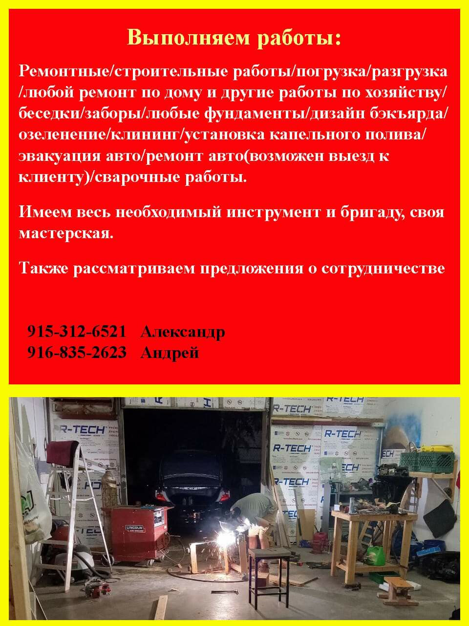 Ремонтні/будівельні роботи/навантаження/розвантаження/будь-який ремонт по дому та інші роботи по господарству/альтанки/огорожі/будь-які фундаменти/дизайн бек'ярду/ озеленення/клінінг/установка крапельного поливу/ евакуація авто/ремонт авто(можливий виїзд до клієнта)/зварювальні роботи.
