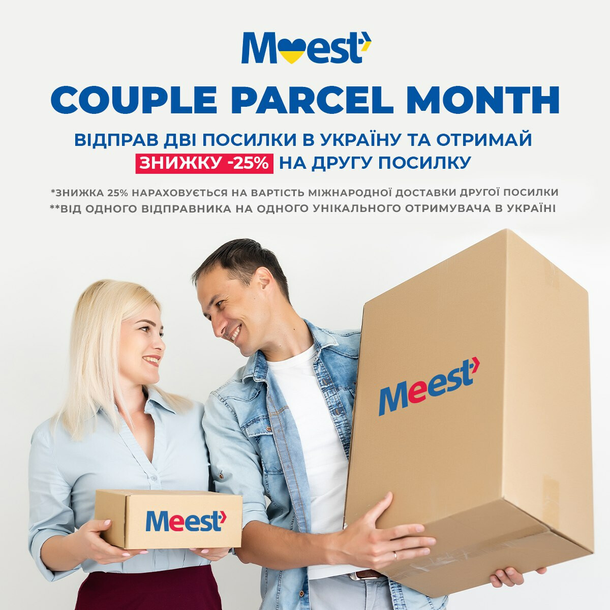 - 25% знижки на доставку другої посилки при відправленні двох посилок разом з США в Україну через Meest Portal. Від одного відправника на одного унікального отримувача в Україні. Реєстрація на Meest Portal є обовязковою - ось тут: us.meest.com/portal