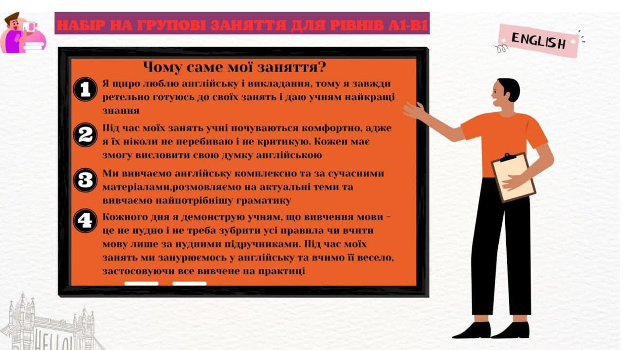 Якщо ти готовий змінювати своє життя і оволодіти мовою, якою розмовляє весь світ, то записуйся на безкоштовну консультацію на якій я розповім як проходять мої заняття