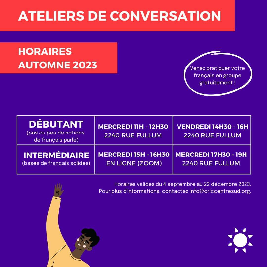 Початковий рівень (базовий рівень або відсутність французької мови): Середа з 11:00 до 12:30 та п'ятниця з 14:30 до 16:00, обидві дати на місці за адресою 2240 rue Fullum.
