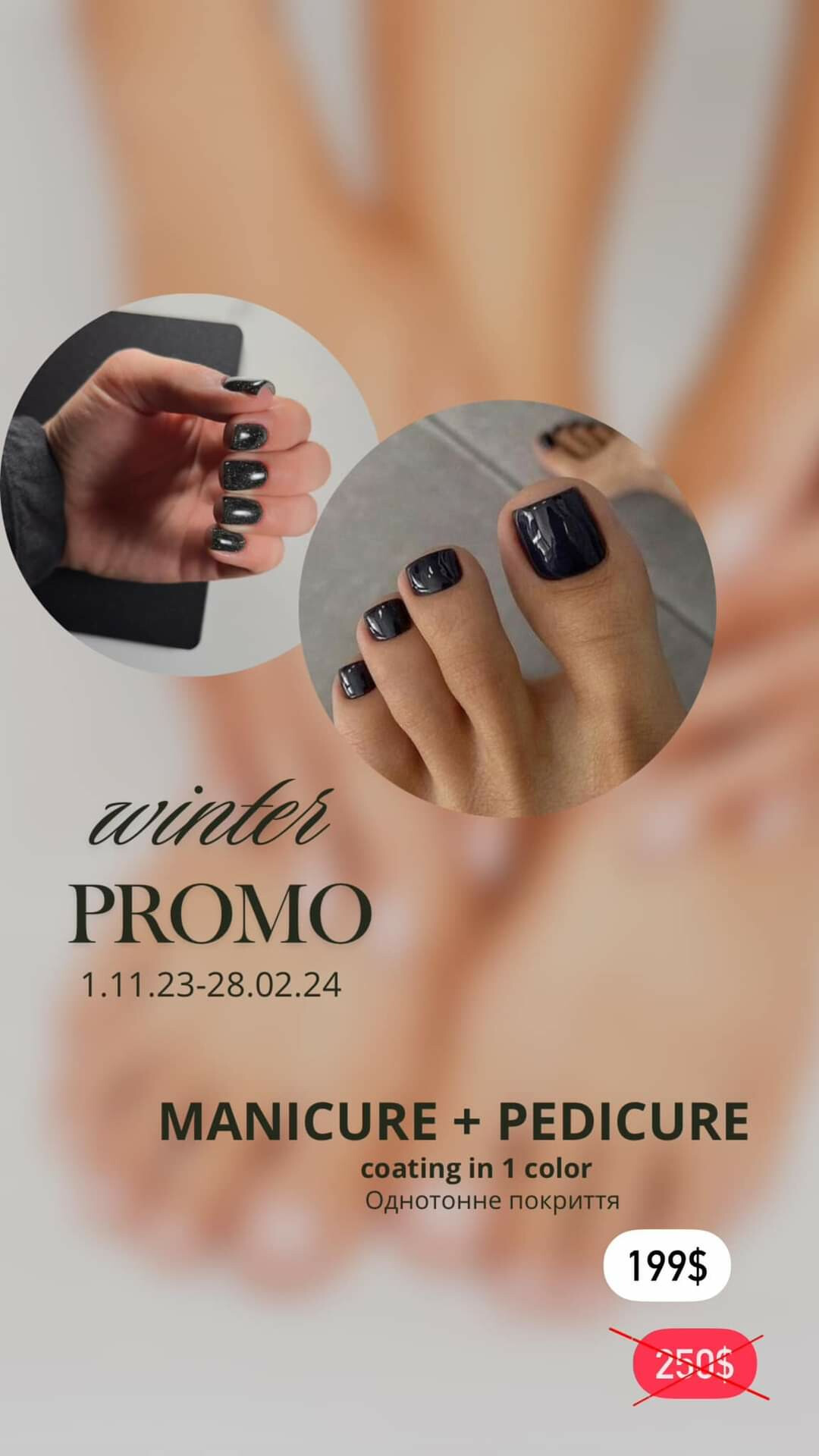 МАНІКЮР + ПЕДИКЮР (зняття + чищення апаратне/комбі + однотонне покриття)
