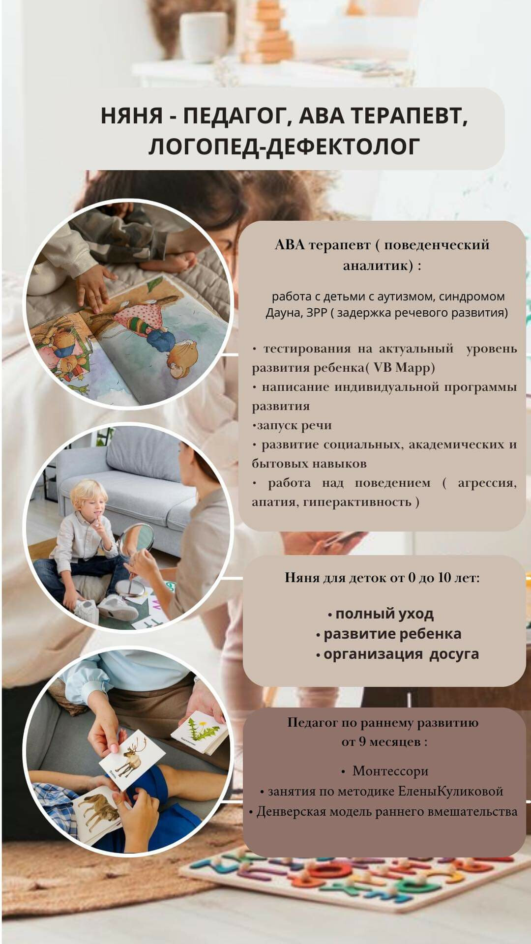 Пропоную послуги Няні-педагога, а також АВА терапевта (поведінковий аналітик, фахівець з раннього розвитку) для дітей у тому числі з аутизмом, синдромом Дауна, ЗРР.