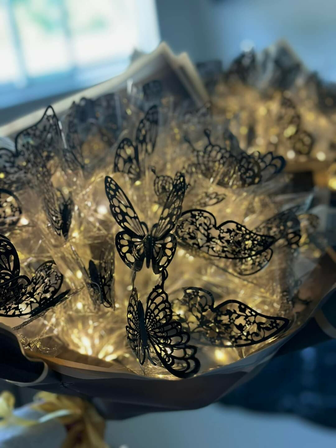 Також створюю прекрасні букети з квітів (які можуть послужити чудовим подарунком), букет з підсвічуванням з метеликів та багато іншого.