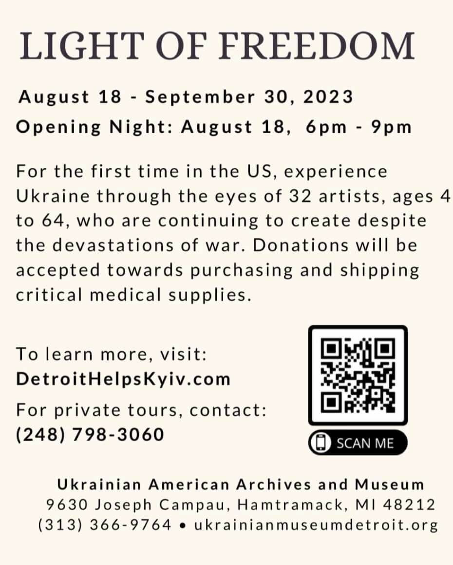 Починаючи з 18 Серпня в Українському Музеї у Hamtrsmck відкривається виставка 32 художників з поглядом на реалії війни в Україні. Серед них ті є і ті хто вже загинув захищаючи Батьківщину. СВІТЛО СВОБОДИ
